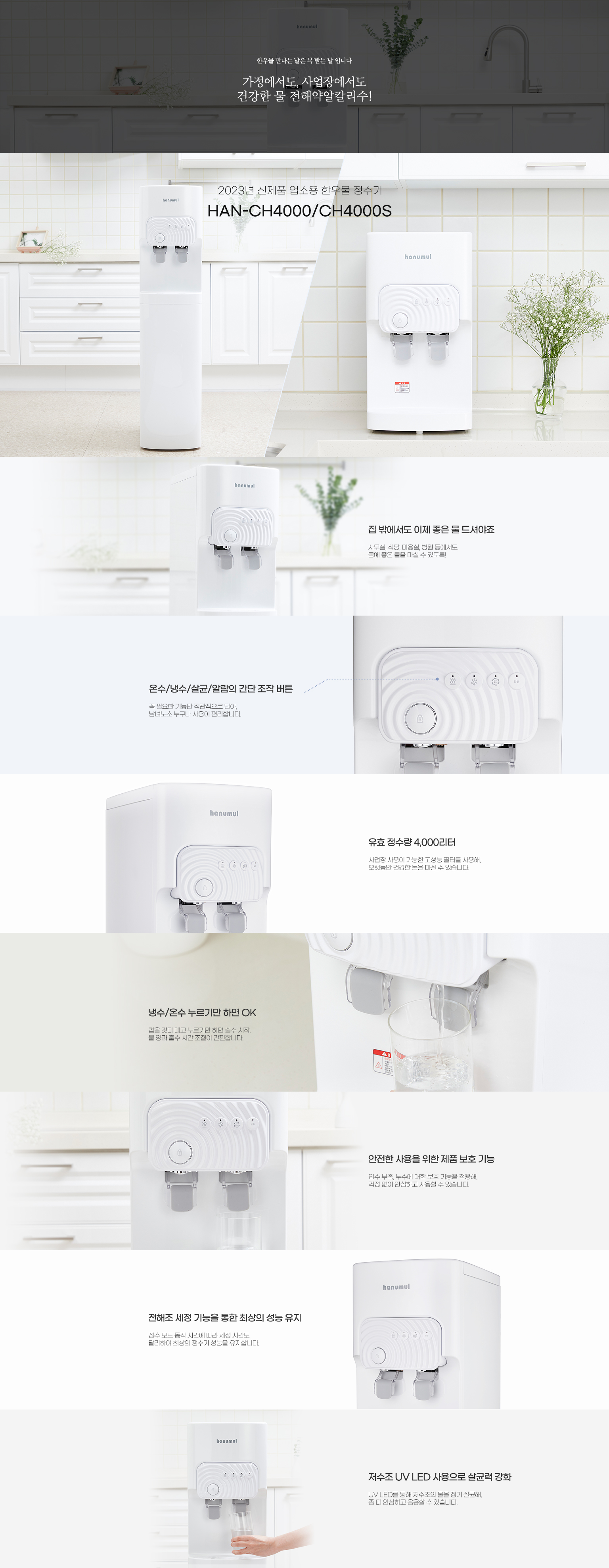 제조사 (주)한우물 제품명 전기 냉수기(전기 순간 온수기) 모델명 HAN-CH4000/CH4000S 색상 화이트 정수방식 이중전기분해 정수방식 중량 HAN-CH4000 19kg/ HAN-CH4000S 16kg 치수 HAN-CH4000 260(W) * 415(D) * 1100(H) mm