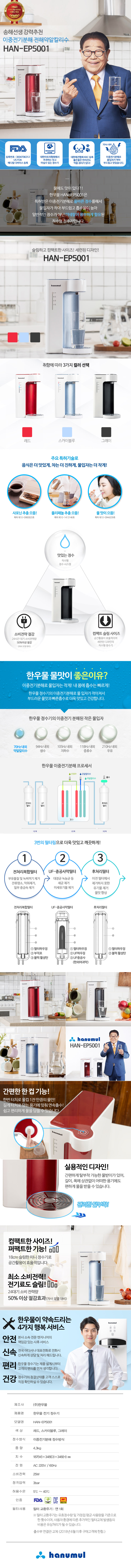 제조사 (주) 한우물 제품명 한우물 전기 정수기 모델명 HAN-EP5001 색상 레드, 스카이 블루, 그레이 정수방식 이중전기분해 정수방식 중량 4.3kg 치수 187(W)*348(D)*346(H) mm 전원 AC 220V / 60Hz 소비전력 대기전력 2W / 소비전력 25W 허용수압 0.5~3.0 kgf/㎠ 허용수온 5~40 ℃ 인증 필터사용 필터 교환주기:연 1 회