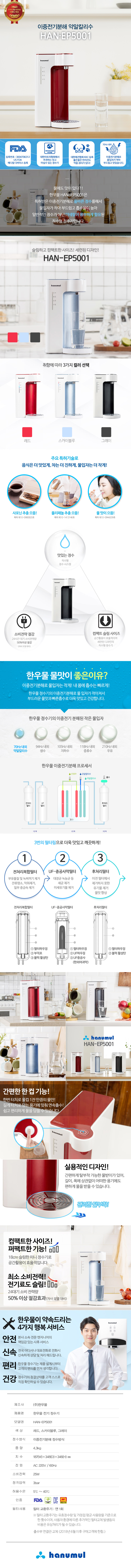 제조사 (주) 한우물 제품명 한우물 전기 정수기 모델명 HAN-EP5001 색상 레드, 스카이 블루, 그레이 정수방식 이중전기분해 정수방식 중량 4.3kg 치수 187(W)*348(D)*346(H) mm 전원 AC 220V / 60Hz 소비전력 대기전력 2W / 소비전력 25W 허용수압 0.5~3.0 kgf/㎠ 허용수온 5~40 ℃ 인증 필터사용 필터 교환주기:연 1 회