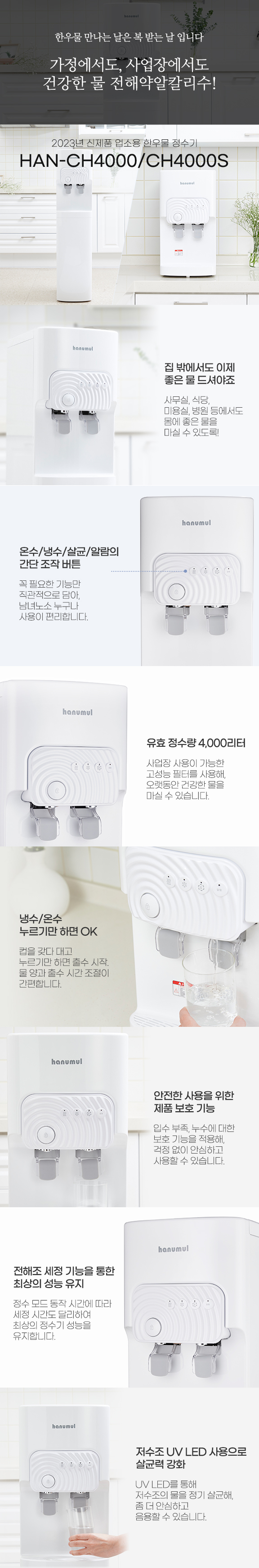 제조사 (주)한우물 제품명 전기 냉수기(전기 순간 온수기) 모델명 HAN-CH4000/CH4000S 색상 화이트 정수방식 이중전기분해 정수방식 중량 HAN-CH4000 19kg/ HAN-CH4000S 16kg 치수 HAN-CH4000 260(W) * 415(D) * 1100(H) mm